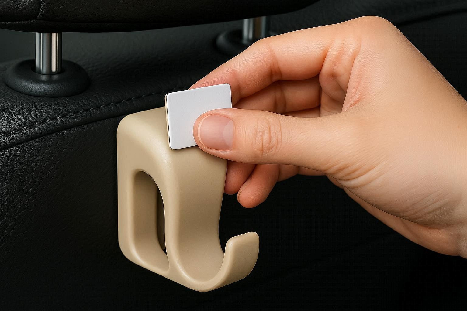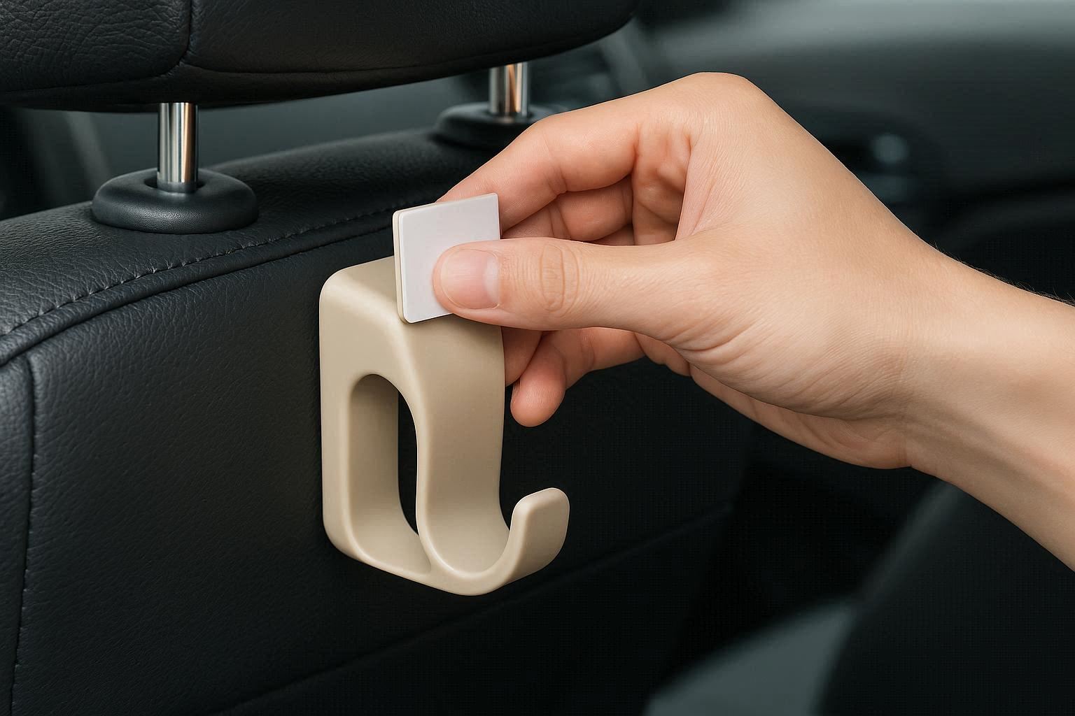 This versatile hook utilizes a high-strength 3M VHB adhesive pad for permanent mounting on leather, plastic, or fabric surfaces without drilling. The anodized aluminum hook supports up to 15 lbs (6.8 kg) and features a sleek, low-profile design that folds flat against the seat back when not in use. The mounting surface is 2.5 inches in diameter for maximum adhesion.