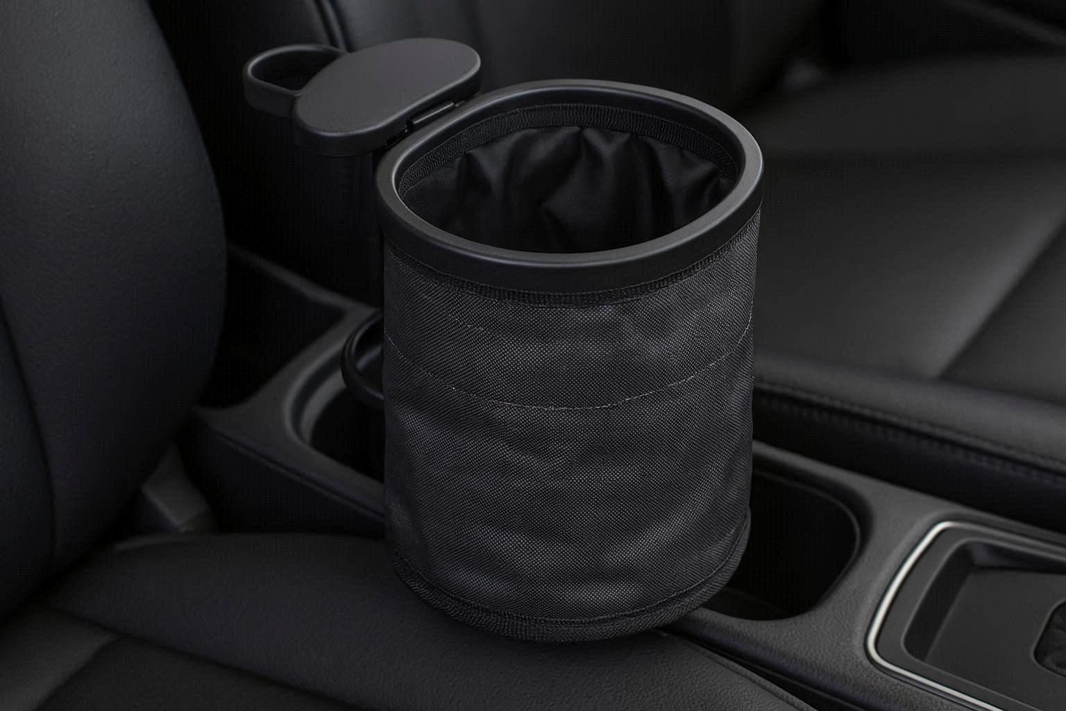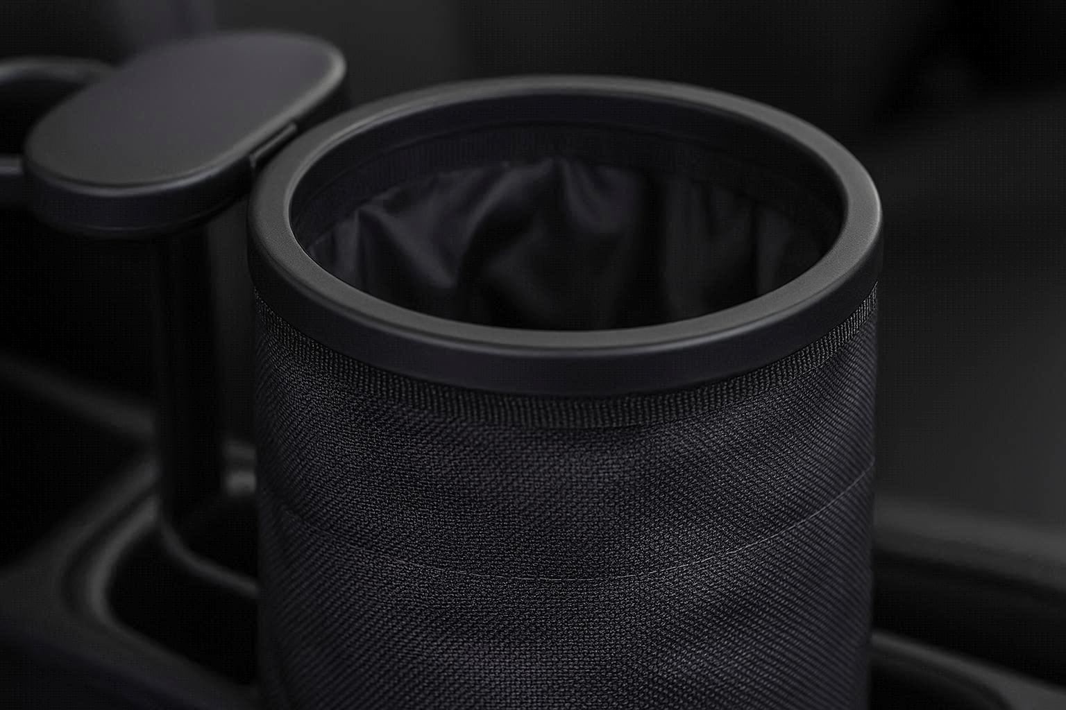 A pull-string closure seals odors. The exterior features a subtle, carbon-fiber pattern. It comes with a small carabiner for attachment to gear when not in use. Perfect for compact cars or as a secondary trash spot for the driver, keeping drink holders functional and waste contained.